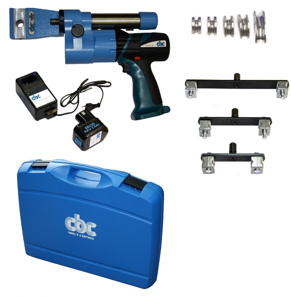 Univerzální, kompaktní, elektrohydraulická ohýbačka s bateriovým pohonem. Slouží k pohodlnému ohýbání žíhaných měděných trubek do Ø 22 mm s tloušťkou stěny do 2,5 mm a vrstvených (Al-pex, MSR) trubek do Ø 32 mm s tloušťkou stěny do 3 mm. Bez kabelu a bez svěráku, všude použitelná. Pro instalace, stavbu, dílnu a opravy. Lze aplikovat veškeré příslušenství z oblíbených hydraulických ohýbaček OB 85S a OB 85/KIT. Baterií poháněný motor v souladu s CEI předpisy o hmotnosti pouhých 2,9 kg. Kvalitní Li-ion Aku 18V/2Ah a rychlonabíječka (nabíjecí čas 50 min). V pevném vypolstrovaném kufru. Sada obsahuje ohýbací segmenty a ramena pro Ø 10-12-15-18-22 mm. K doplnění hladiny oleje u hydraulických ohýbaček CBC použít olej Shell Morlina S2 BL 10.