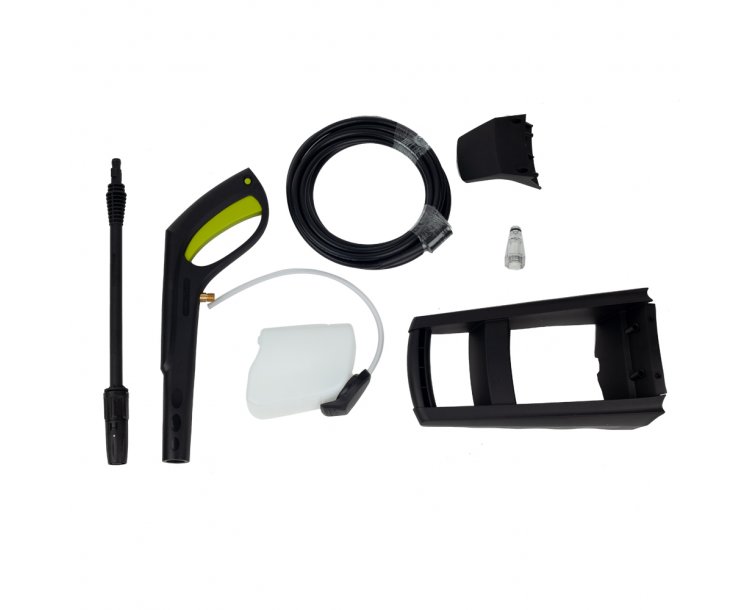 Součástí balení: vysokotlaká hadice, láhev na čistící prostředek, spouštěcí pistole, rozstřikovací násada, variabilní tryska (s nastavením tlaku), přípojka přívodu vody, čistící špička trysek, upevňovací prvky (sada).